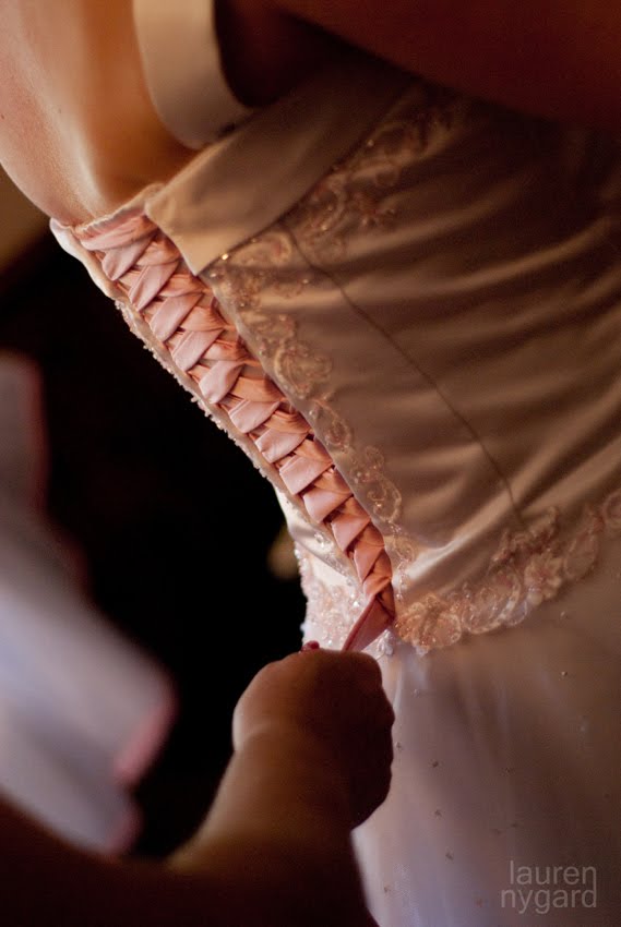 R's mom had the honor of tying up the back of her dress. She did a great job, too! :)